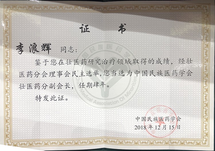 熱烈慶祝,12月15日,強壽集團董事長李浪輝因壯醫(yī)藥研究治療領(lǐng)域取得的成績,經(jīng)壯醫(yī)藥分會理事會民主選舉,當(dāng)選為中國民族醫(yī)藥學(xué)會壯醫(yī)藥分會副會長!!!