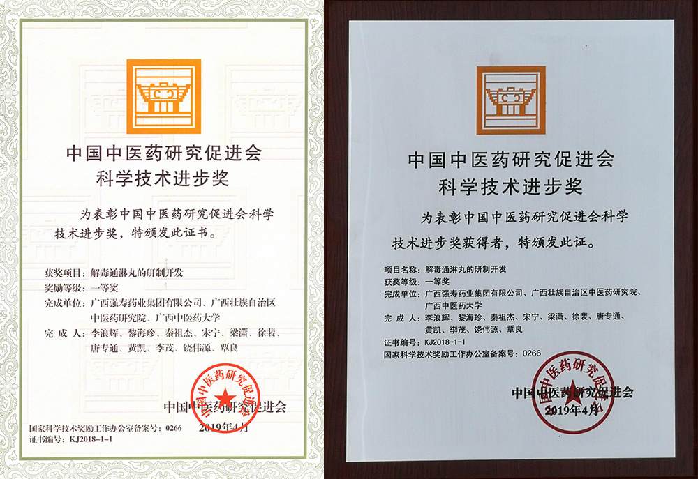 廣西強壽藥業(yè)集團有限公司獨家研發(fā)生產(chǎn)的治療非淋民族藥——解毒通淋丸榮獲2018年中國中醫(yī)藥研究促進會科技進步一等獎(省部級獎項,一等獎項類別中排名第1位)。